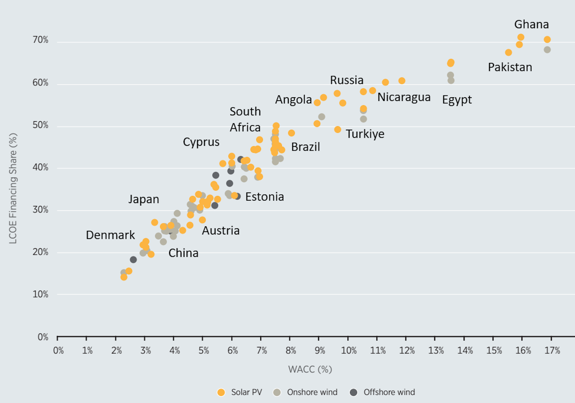 These countries need to meet soaring energy demand. The International Energy Agency expects emerging economies to account for 85% of added electricity demand[21] from 2025 through 2027. Yet renewable energy development lags in most of them. The main reason is the high price of financing renewable energy construction.