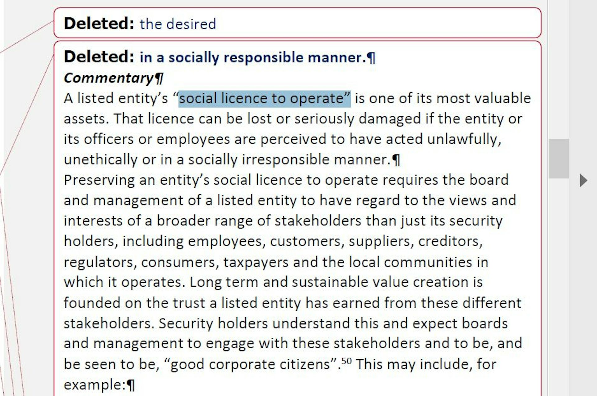 According to the Australian Financial Review[5] the Council came to the view that the phrase was “contentious” and that it would “create problems for companies in the gaming, alcohol, tobacco, fast food and mining sectors” – the very sectors where corporate responsibility is at constant risk, and governance is most needed.