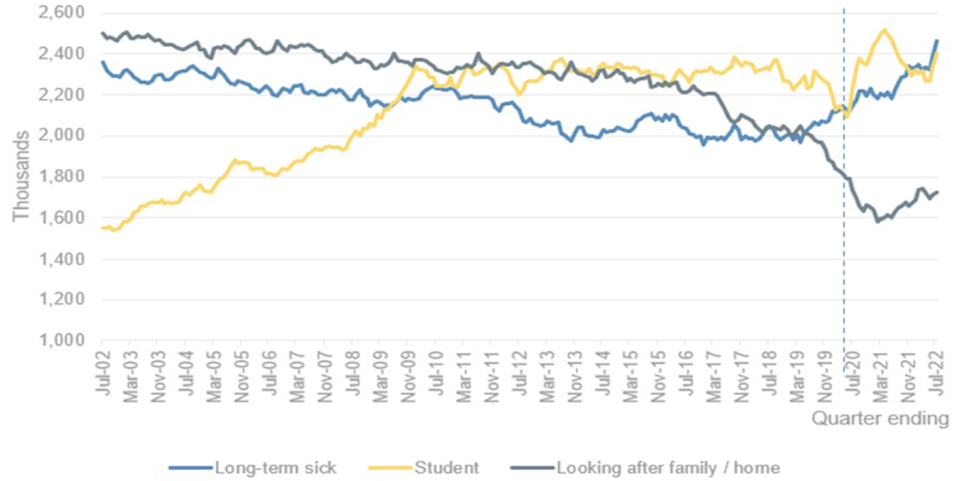 But perhaps the most dramatic change has been the number of people with long-term or chronic illnesses who have been leaving work altogether (the blue line). With 170,000 people[6] swelling the ranks of this group in the last month alone, they now total nearly 2.5 million – the largest number of long-term sick out of work in our history. The last time the numbers approached this level was two decades ago.