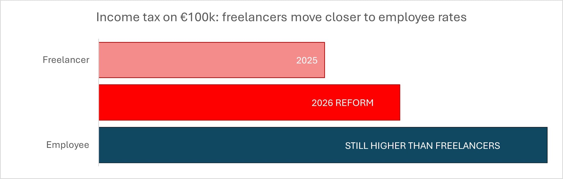 Until the end of 2025, freelancers paid a flat 15% income tax. But now this is replaced by a progressive regime of 20%, 25% and 32%. Lower-income sole traders are protected by a structured tax credit on the first €20,000 of income, which tapers out up to €42,500.