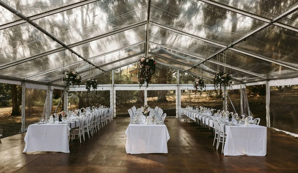 Clear roof structures can create a beautiful setting for evening celebrations, allowing natural light or night skies to enhance the mood while still offering protection.