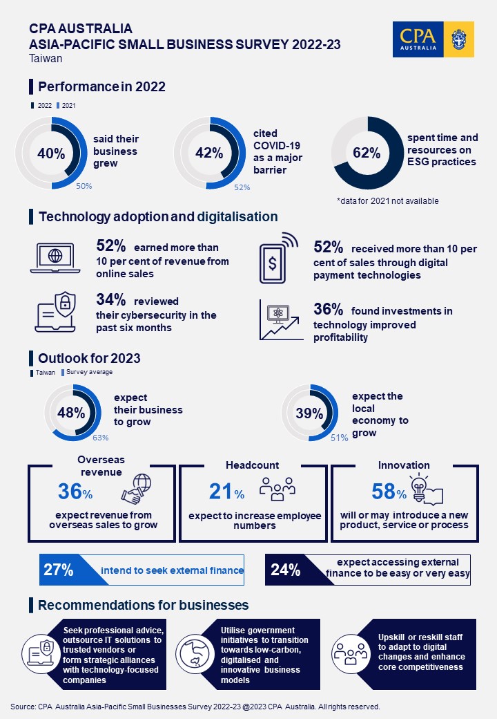 TAIPEI, TAIWAN - Media OutReach - 26 April 2023 - Almost half of Taiwanese small businesses expect to grow in 2023. Digitalisation is likely to be the catalyst for their growth, according to CPA Australia's Asia-Pacific Small Business Survey.