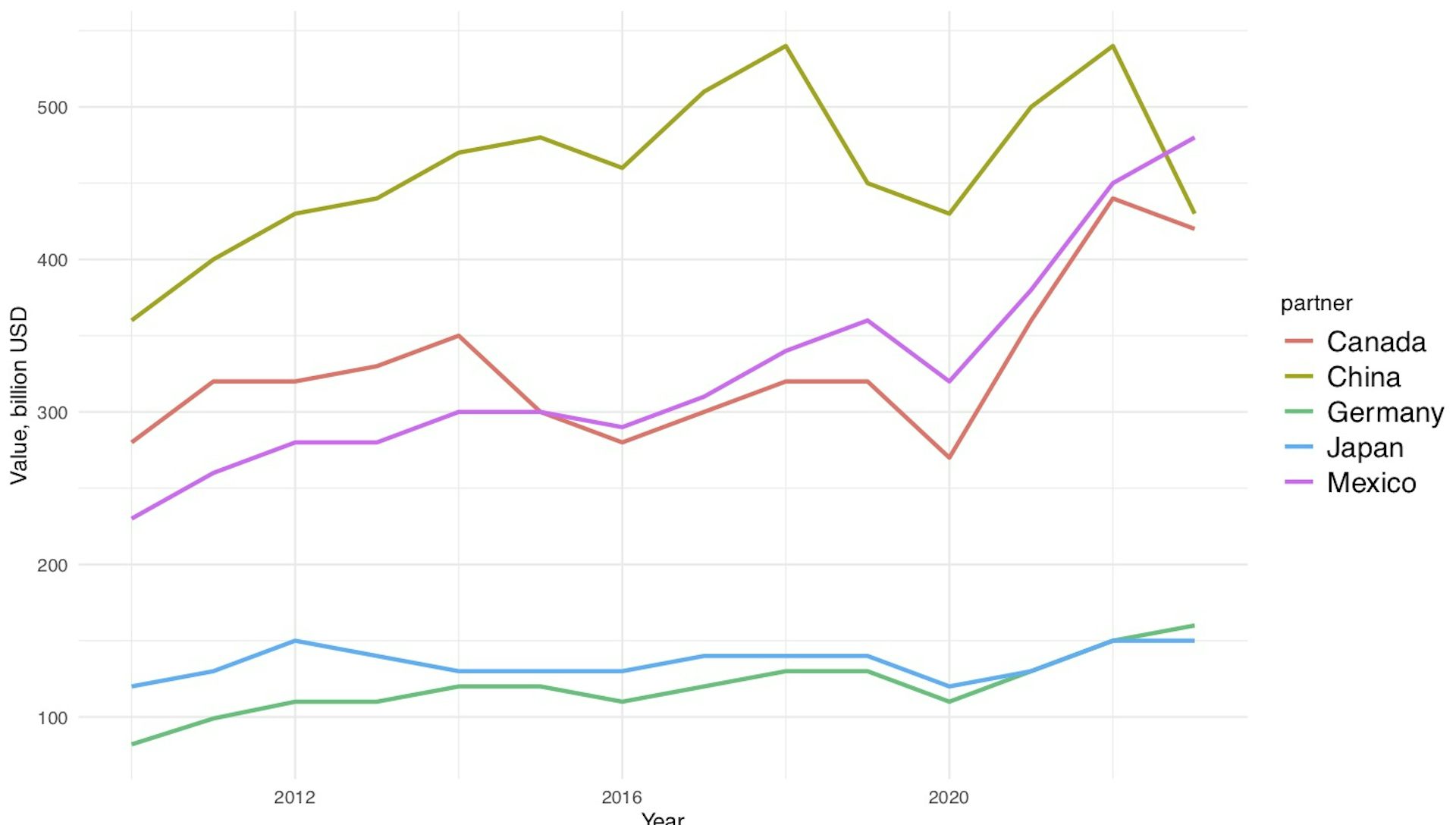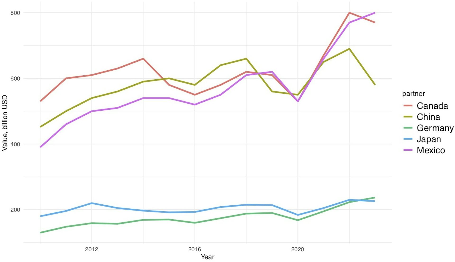 One of the most high-profile results of a friend-shoring policy is that Canada and Mexico have recently replaced China as America’s largest trading partners by total trade, while Mexico has overtaken China as America’s top importer (see figures below). This followed the introduction of Donald Trump’s trade strategy[3], which aimed to reduce US dependence on Chinese goods – partly for political reasons and partly because of Trump’s perception of China as a rival power.